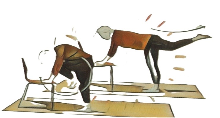 Vor dem Stuhl stehen, etwa eine Fußlänge entfernt. Die Hände sind so auf der Sitzfläche platziert, dass man einen guten Halt hat.
