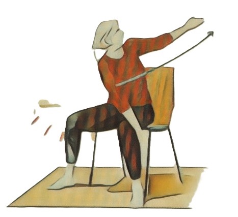 Beim Ausatmen so weit wie möglich nach links drehen und den linken Arm über die Stuhllehne nach hinten strecken. Drei bis fünf Atemzüge halten. Beim Einatmen aufrichten und die Wirbelsäule nach oben strecken, beim Ausatmen – wenn möglich – etwas weiter nach links drehen. Mit einer Einatmung beide Arme heben und den Oberkörper zurück zur Mitte drehen. Ausatmend die Arme senken und die Hände auf den Beinen ablegen. Einige Momente nachspüren. Mit rechts wiederholen.