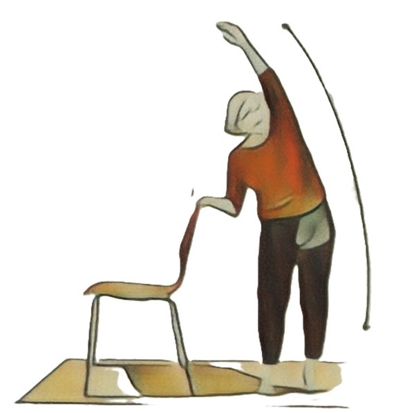 Beim Ausatmen so weit nach rechts lehnen wie möglich. Die Füße bleiben fest am Boden. Den linken Arm so weit wie möglich strecken und die Dehnung für drei bis fünf Atemzüge halten. Beim Einatmen wieder aufrichten den linken Arm noch einmal nach oben strecken und mit der Ausatmung sinken lassen.